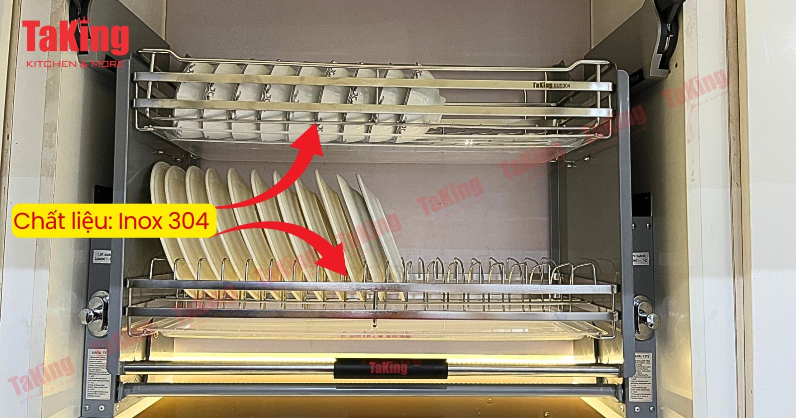 - Thiết kế thông minh, tiện dụng: Các sản phẩm của TaKing có thiết kế thông minh giúp tối ưu hóa không gian bếp, mang lại sự tiện nghi tối đa cho người sử dụng. Ví dụ như: Kệ bát đĩa nâng hạ có thể điều chỉnh linh hoạt, nâng lên hạ xuống giúp cho bạn dễ dàng sử dụng và phù hợp cho nhiều người, người già, trẻ con, người có chiều cao khiêm tốn cũng dễ dàng sử dụng.