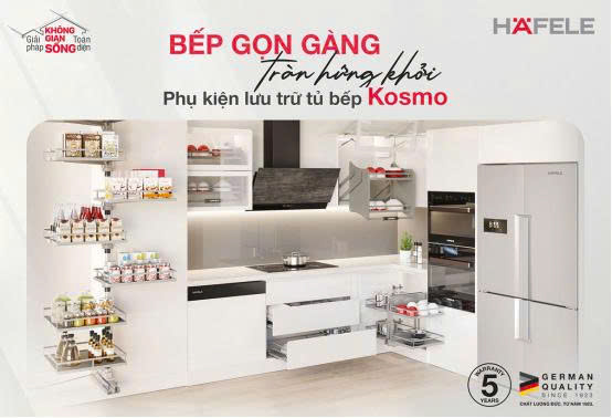 - Phụ kiện đa dạng, phong phú: Hafele cung cấp đa dạng các loại phụ kiện như: Kệ gia vị, kệ dao thớt, kệ treo ly và các hệ thống ngăn kéo chia ngăn linh hoạt.